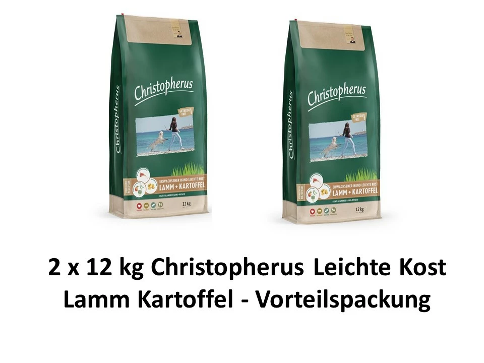 Sind Sie auf der Suche nach Christopherus Leichte Kost mit Lamm und Kartoffel im 2x 12 kg Vorteilspack werden Sie bei zooheld.de fündig. Bei uns bekommen Sie alles, was Sie für die Haltung und Pflege Ihres Haustieres benötigen. Ob Hund, Katze, Fische, Nager, Vögel oder Pferde, bei uns können Sie Ihren kompletten Tierbedarf kaufen. Wir führen neben Nass- und Trockenfutter auch Spezialfutter für Problemfälle. Sie werden bei uns auch immer günstige Angebote finden und praktische Vorratspackungen. Ab einem Bestellwert von 29 Euro liefern wir Ihnen die Ware versandkostenfrei an Ihre Wunschadresse. Natürlich können Sie die Artikel innerhalb von 30 Tagen zurückgeben, falls Sie Ihnen nicht gefallen. Sehen Sie sich einfach in unserem großen Sortiment um und finden Sie alles was Sie benötigen. Bei Fragen und Anregungen steht Ihnen unser Support zur Verfügung, der Ihnen gerne weiterhilft.