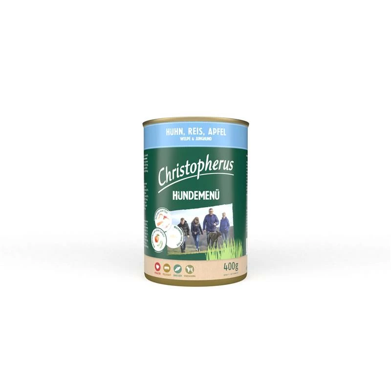Unser Christopherus Hundemenü mit Huhn, Reis, Apfel wird mit frischem Fleisch und Innereien