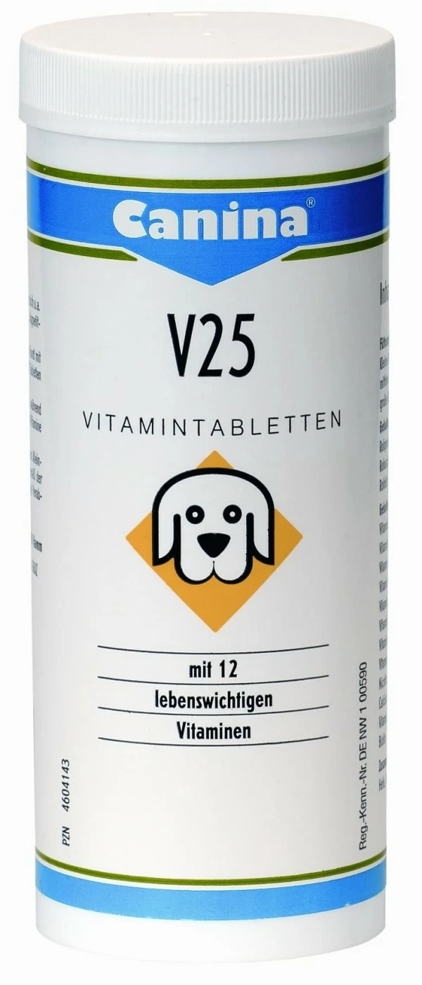 Zu den zahlreichen Ergänzungsfuttermitteln des bekannten deutschen Herstellers Canina Pharma gehören auch verschiedene Vitaminpräparate für Haustiere. Hier stellt Ihnen Zooheld die V 25 Vitamin-Tabletten für Hunde vor, die gedacht sind zum Ausgleich von fütterungsbedingten Nährstoffdefiziten und Mangelerscheinungen, welche sich zum Beispiel durch ein glanzloses Fell, Nervosität, Wachstumsstörungen oder Appetitlosigkeit äußern können. Die in den Tabletten enthaltenen 12 lebenswichtigen Vitaminen fördern die Blutbildung, unterstützen den Eiweiß- und Fettstoffwechsel und sorgen für ein gesundes Nervensystem. Vitamin D wird für die Calciumerschließung benötigt. Geeignet sind die Tabletten für alle Hunde, insbesondere aber für tragende und säugende Hündinnen, für Welpen während der Wachstumsphase und für Vierbeiner in besonderen Stresssituationen. Zooheld liefert Ihnen die Tabletten in der 200 g Dose. Als Fütterungsempfehlung gibt der Hersteller folgendes an (Angaben in Tabletten pro Tier und Tag):