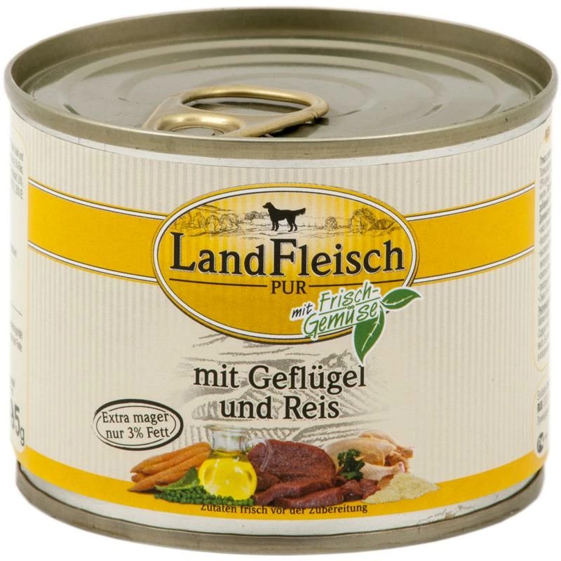 Wenn Sie nach einem Futter mit niedrigem Fett- bzw. Rohproteingehalt suchen, das Ihren Hund trotzdem mit einem unverfälschten Fleischgeschmack überzeugt, dann sollten Sie unbedingt einmal diese LandFleisch Sorte ausprobieren, die Zooheld Ihnen im Vorratspack mit 12 Dosen zu je 195 g nach Hause liefert. Der bekannte deutsche Hersteller Dr. Alder, von dem die vielen verschiedenen LandFleisch Produkte stammen, die Sie günstig bei Zooheld online bestellen können, verarbeitet ausschließlich frische und gesunde Rohstoffe in seinem Futtermitteln, die sich generell durch ein sehr gutes Preis-Leistungs-Verhältnis auszeichnen. Weitere Vorzüge sind der sehr hohe Fleischanteil von 90 % (eine Volldeklaration dieser LandFleisch-Sorte finden Sie unter Details), wobei ausschließlich schlachtfrisches Fleisch in Lebensmittelqualität eingesetzt wird. Das verarbeitete Gemüse stammt aus kontrolliert ökologischem Anbau, während der enthaltene Reis gemeinsam mit ausgewogenen Rohfasern für eine optimale Verdauung des Futters sorgen. Das äußerst schmackhafte Menü, das in modernen Produktionsanlagen schonend zubereitet wird, enthält weder Getreide noch Soja; künstliche Zusätze zur Konservierung, Färbung oder Geschmacksverstärkung fehlen ebenso wie gentechnisch veränderte Rohstoffe. Ausreichend enthalten sind dagegen Omega-3- und Omega-6-Fettsäuren, deren positiver Einfluss auf die Gesundheit der Haut bzw. das Aussehen des Fells unbestritten ist; die zugesetzten Vitamine und Ballaststoffe unterstützen den Stoffwechsel Ihres Hundes und stärken gleichzeitig seine natürlichen Abwehrkräfte. Bei Zooheld erhalten Sie auch alle anderen LandFleisch Varietäten für eine abwechslungsreiche und artgerechte Ernährung Ihres Schützlings – dabei gilt immer das Motto „Hohe Qualität zu bezahlbaren Preisen“, nach dem Dr. Alder seine zahlreichen verschiedenen Futtermittel produziert.